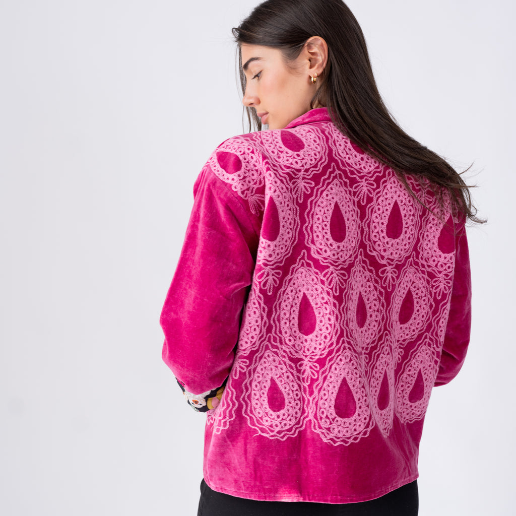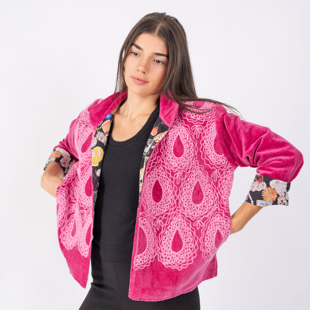 Modern design meets traditional techniques with our new jackets. Proudly crafted by makers in Jaipur, India and lined with Betsy's hand painted prints these pieces are a cultural collaboration of artistry and design. Working closely with the sew shop, Betsy designed the embroidery to coordinate with her printed lining and carefully selected all of the colors, including the custom dyed velvet. These jackets are a standard Indian Free Size, fitting US sizes 2-10.