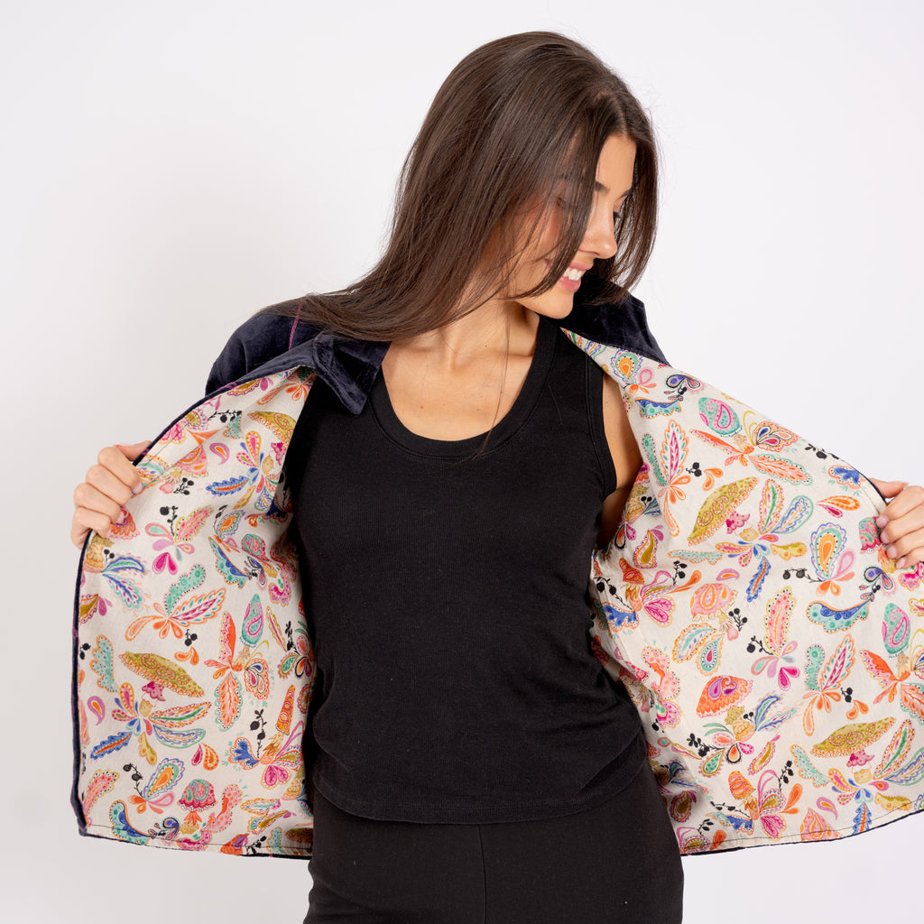 Modern design meets traditional techniques with our new jackets. Proudly crafted by makers in Jaipur, India and lined with Betsy's hand painted prints these pieces are a cultural collaboration of artistry and design. Working closely with the sew shop, Betsy designed the embroidery to coordinate with her printed lining and carefully selected all of the colors, including the custom dyed velvet. These jackets are a standard Indian Free Size, fitting most US sizes 2-10.