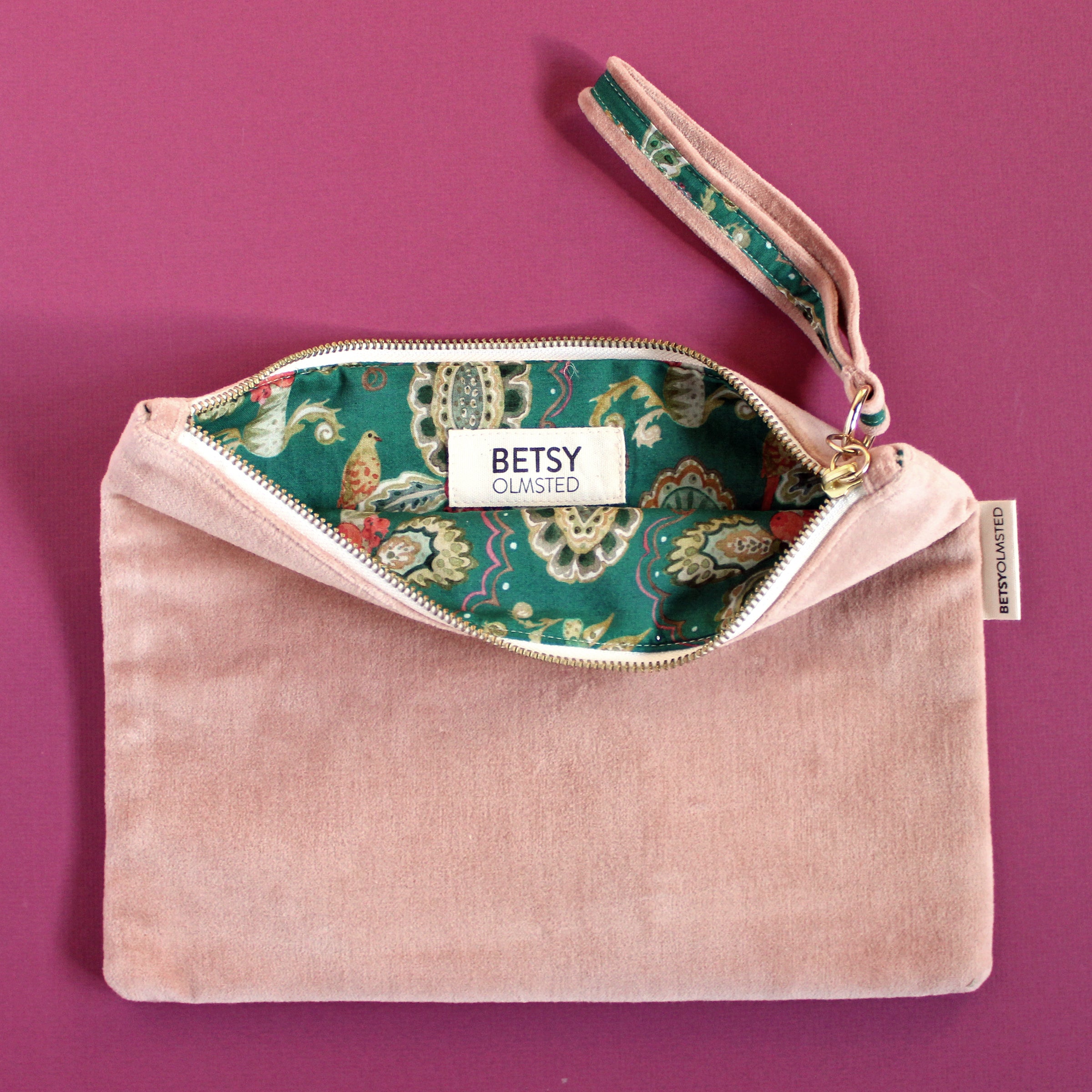 Richly hued velvet meets playful prints with our jewel toned pouches.  Each piece in lined with Betsy's watercolor designs to coordinate with soft velvet outer.  Keep it inside your tote or carry on its own as a clutch.