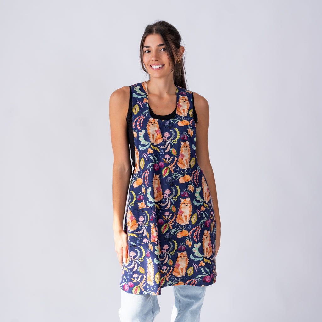 Inspired by the vintage 70’s smock, these cross back, pullover aprons are one of our bestsellers and a customer favorite.  Perfect in both the kitchen and garden, the full coverage and side pocket provide comfortable protection from cooking and planting alike.  Colorful and conversational, they feature Betsy’s original watercolor designs.